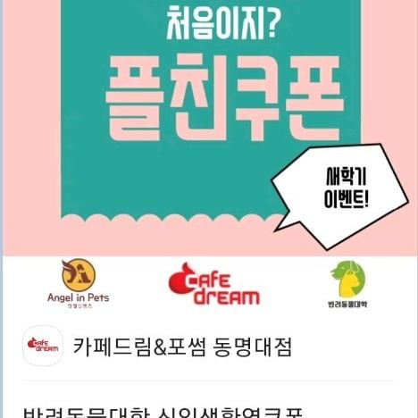 동명대 반려동물대학ㆍ반려동물수제간식전문 엔젤인펫츠와 카페드림&포썸에서 반려동물대학 신입생 여러분에게 1+1음료쿠폰을 쏘내요.^^♡ 감사합니다