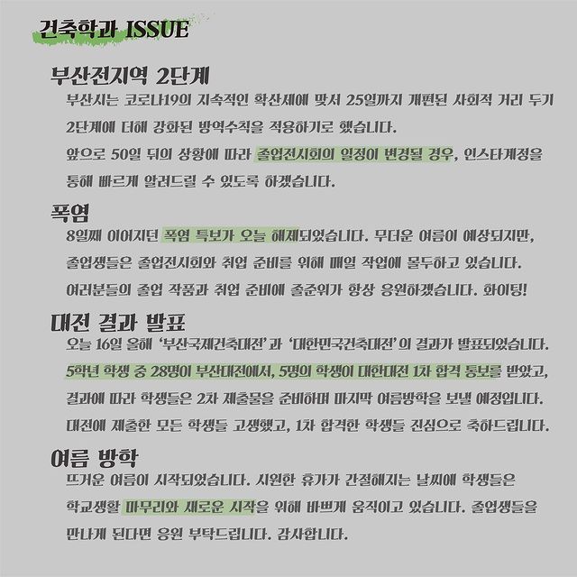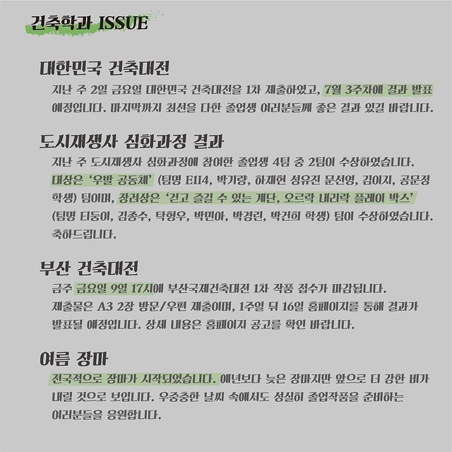 여름 휴가 관계로 D-40의 건축학과 이슈는 쉬어가겠습니다. 모두들 시원한 휴가 보내세요🍉