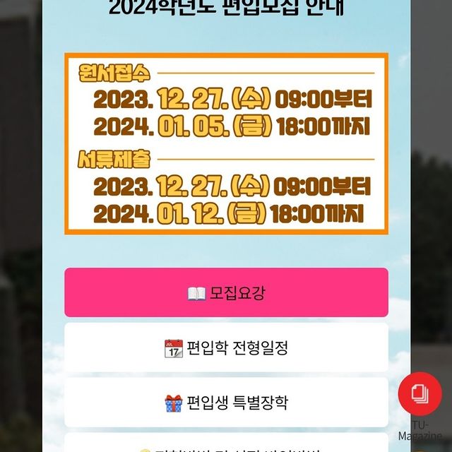 동명대학교 뷰티산업학과 편입일정안내(2023.12.27~2024.01.05)