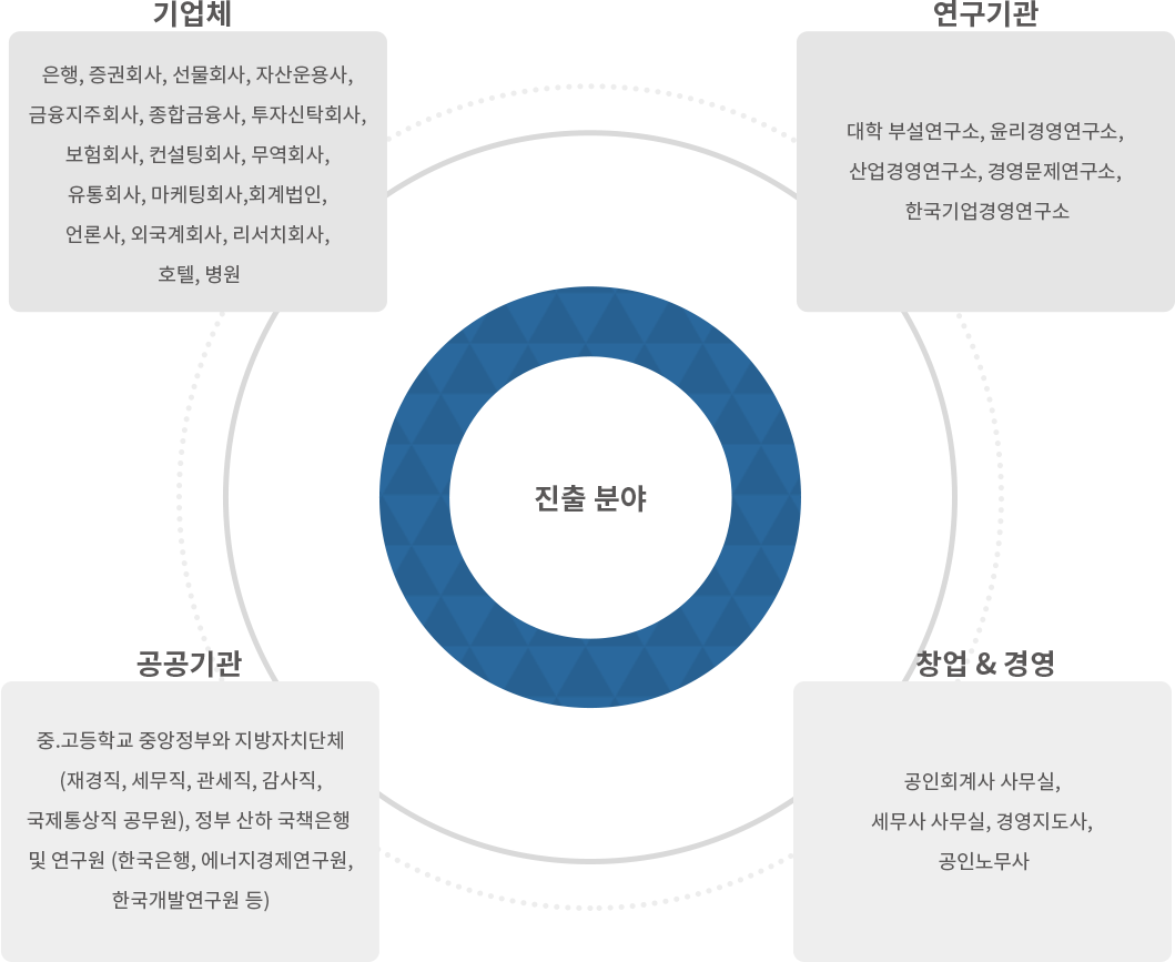 - 중·고등학교 중앙정부와 지방자치단체(재경직, 세무직, 관세직, 감사직, 국제통상직 공무원), 정부 산하 국책은행 및 연구원 (한국은행, 에너지경제연구원, 한국개발연구원 등)