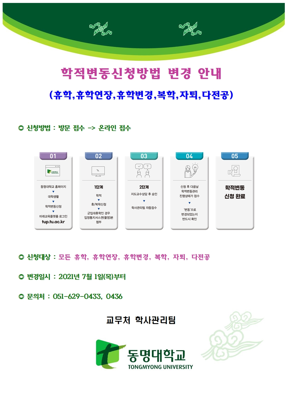 학적변동 신청방법 변경 안내 (휴학, 복학, 자퇴, 다전공)