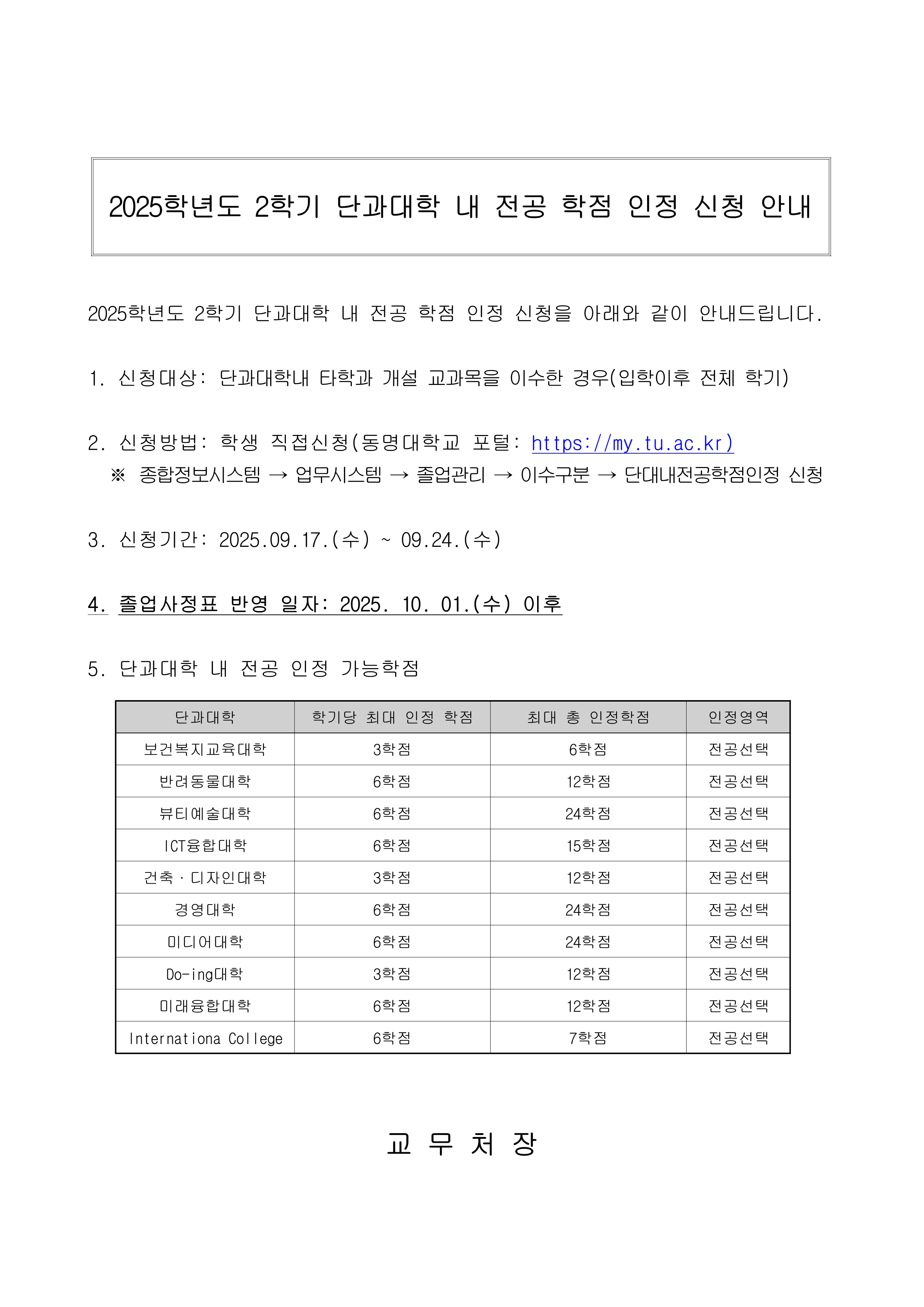2025학년도 2학기 단과대학 내 전공 학점 인정 신청 안내