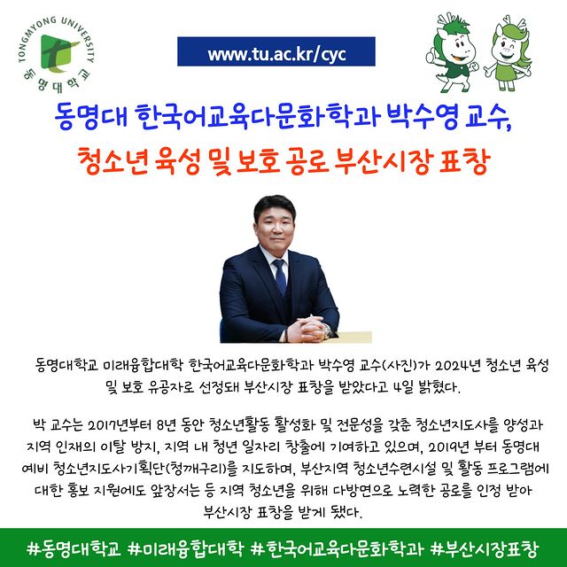 동명대 한국어교육다문화학과 박수영 교수, 청소년 육성 및 보호 공로 부산시장 표창