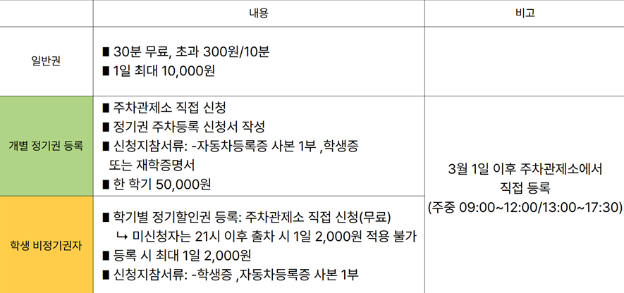 2. 개인 차량 소지 시 개별 정기권 및 학생 비정기권 등록 부탁드립니다.