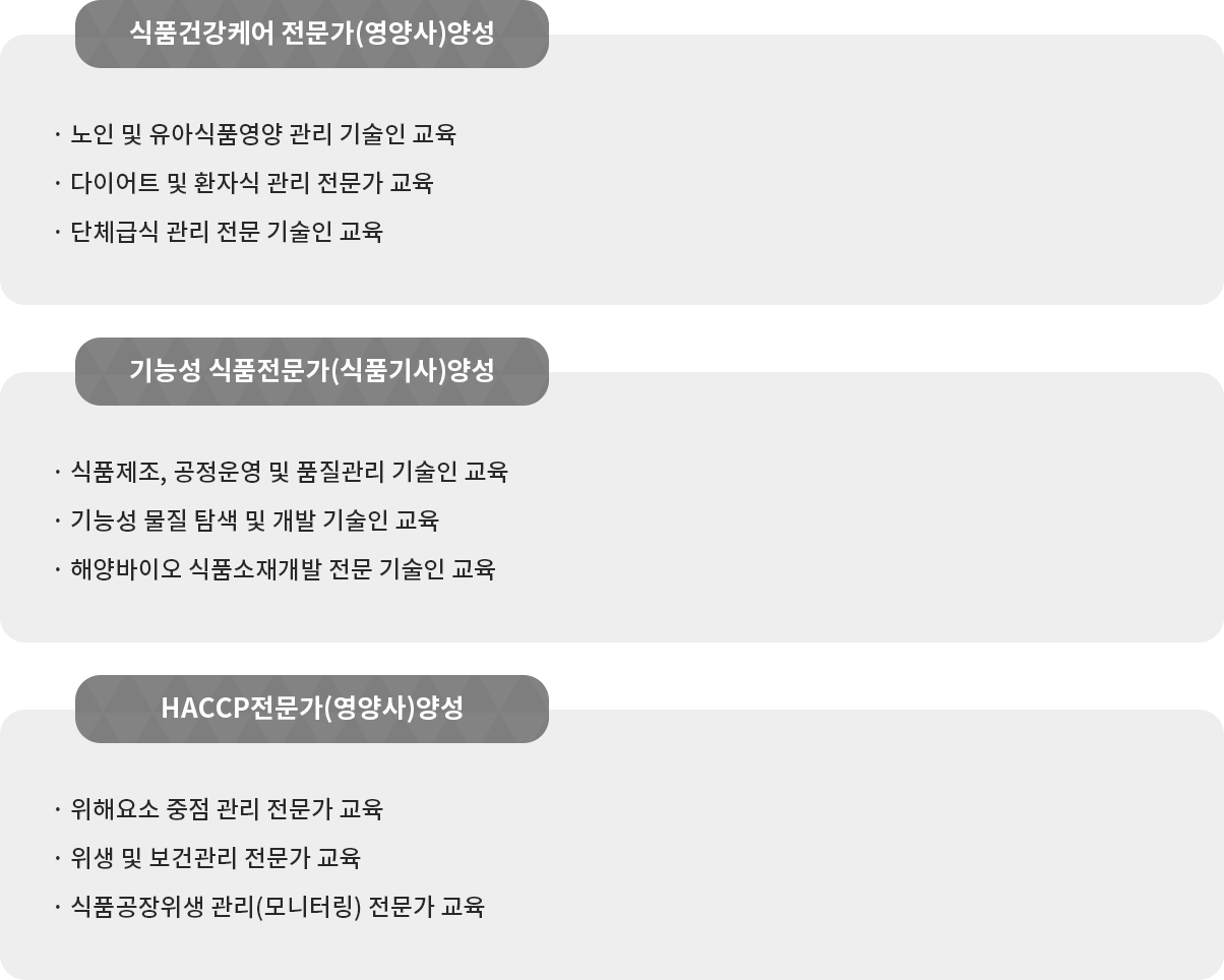경쟁력 있는 식품의 제조, 공정운영, 품질관리 등을 담당하는 기능성식품 전문가, 식품 생산 과정 중 혼입될 수 있는 위해 요소를 제어하여 안전한 식품을 제조할 수 있는 위해 요소중점관리(HACCP) 전문가, 질병예방과 건강증진을 위해 급식관리 및 영양서비스를 수행하는 영양사 및 식생활 건강 케어 전문가를 양성한다.