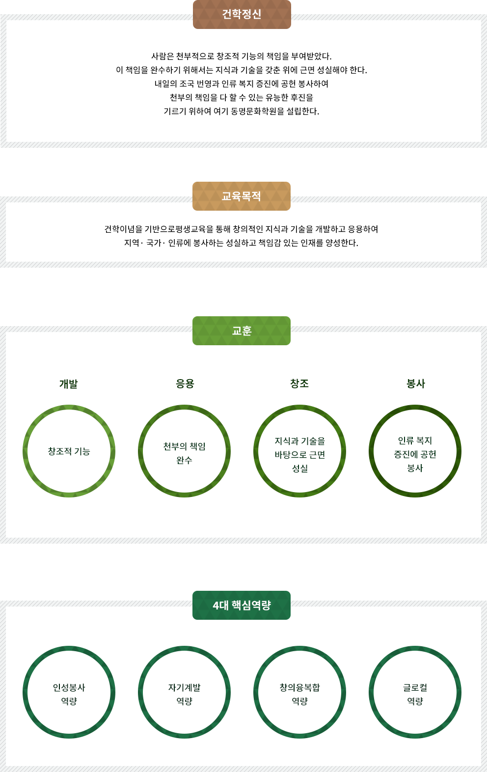 - 지성인, 전문인, 평생학습인 그리고 국제인으로서 배우고 이힌 지식과 기술로 지역사회, 국가, 세계 인류공영을 위해 헌신하는 봉사인 양성