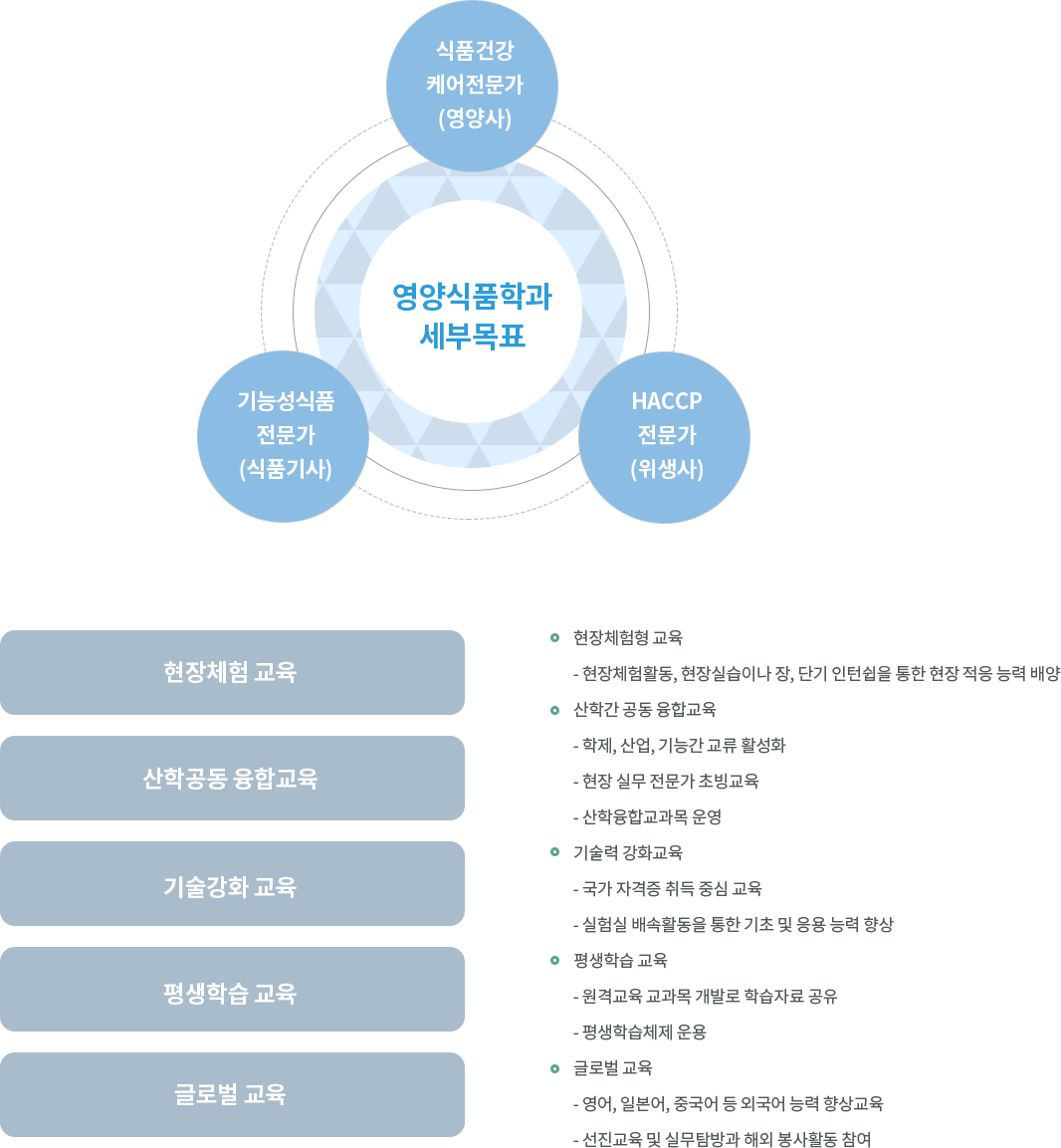 식품영양에 관한 기초지식을 바탕으로 새로운 기능성 식품자원의 영양학적 탐색과 먹거리의 개발을 통한 미래지향적 기능성 식품산업의 수요에 부응하고, 천연 및 가공식품의 위해성을 극복하여 국민 보건위생과 건강케어를 담당할 수 있는 실무형 식품영양 및 식품과학기술 전문가 양성을 담당하고자 한다.