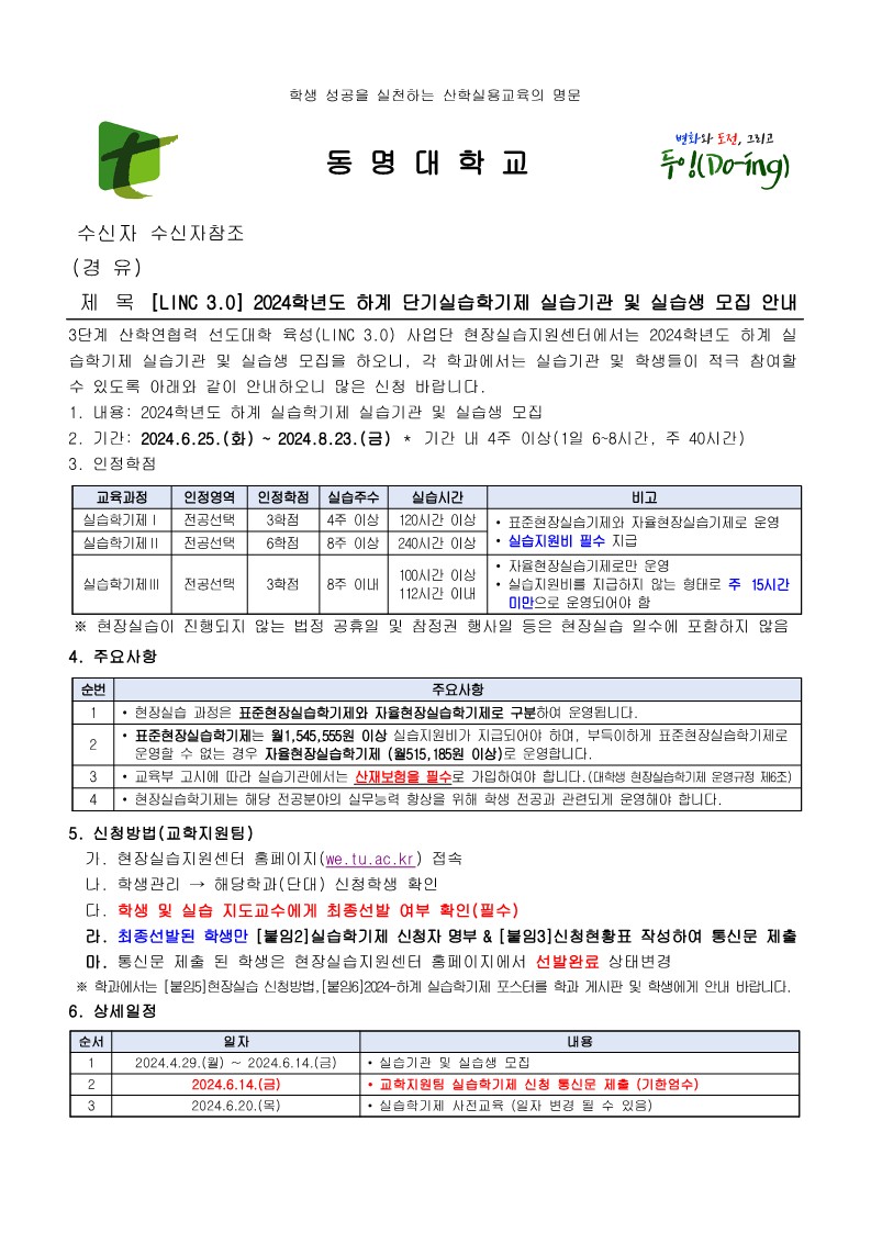 [LINC 3.0] 2024학년도 하계 단기실습학기제 실습기관 및 실습생 모집 안내