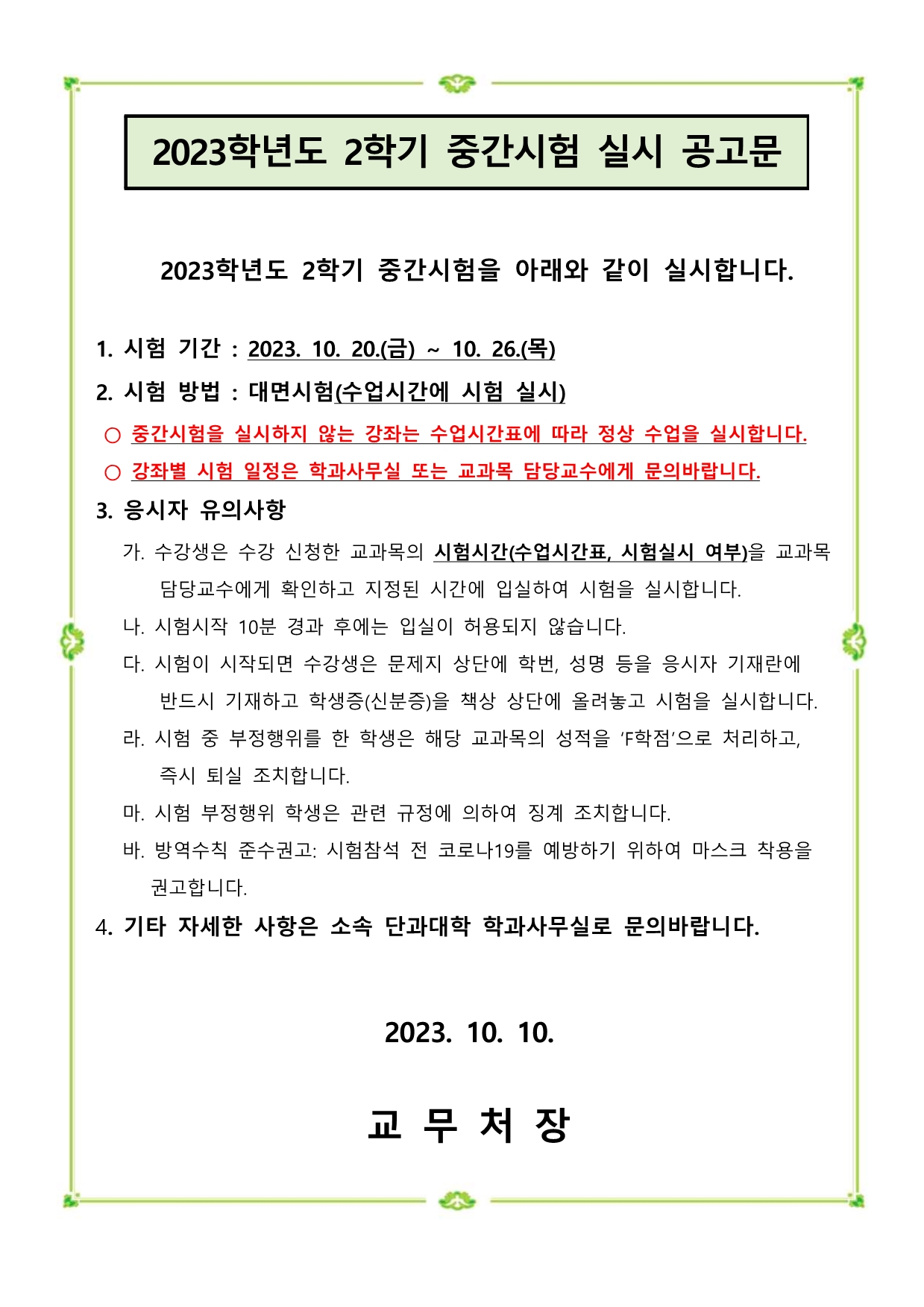 2023학년도 2학기 중간시험 일정 안내