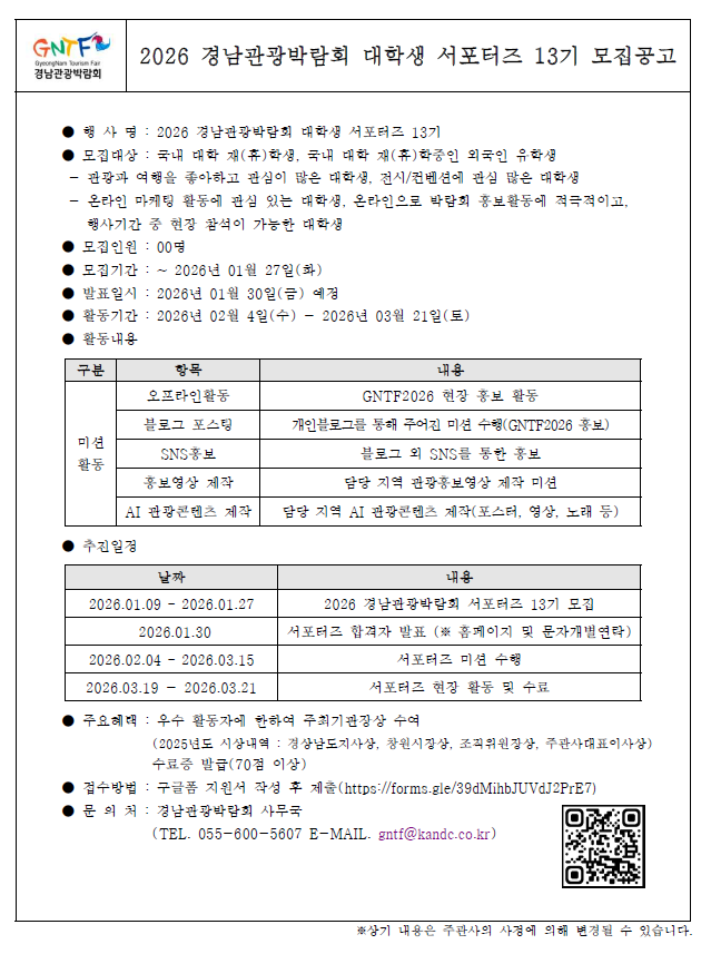 [공지] 2026 경남관광박람회 대학생서포터즈 13기 모집 안내 경남의 우수한 관광지와 관광상품 및 서비스를 알리는 제2의 경남관광 홍보 도우미!