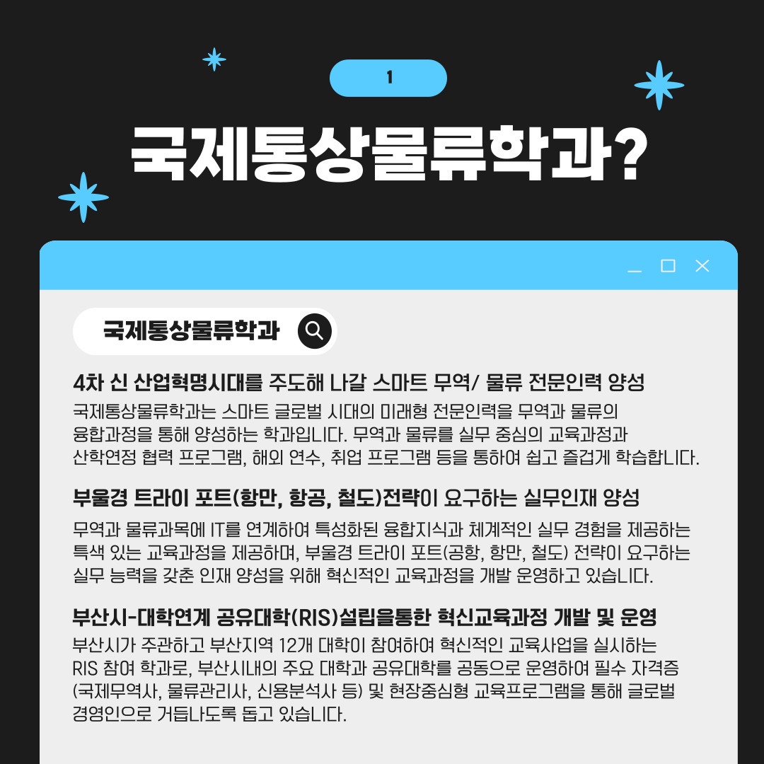 국제통상물류학과를 한 눈에 알아볼 수 있는 카드뉴스입니다. 예비신입생 여러분의 선택에 많은 도움이 되길 바랍니다.