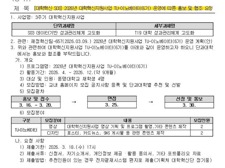 [대학혁신 S03] TU-이노베이터(6기) 홍보 요청 안내