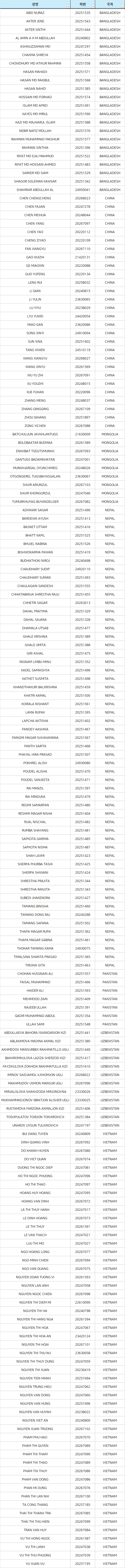 - 아래 명단에 이름이 있는 경우 국제교류팀(17번 건물 304호)에 방문하여 수령해주시기 바랍니다.
