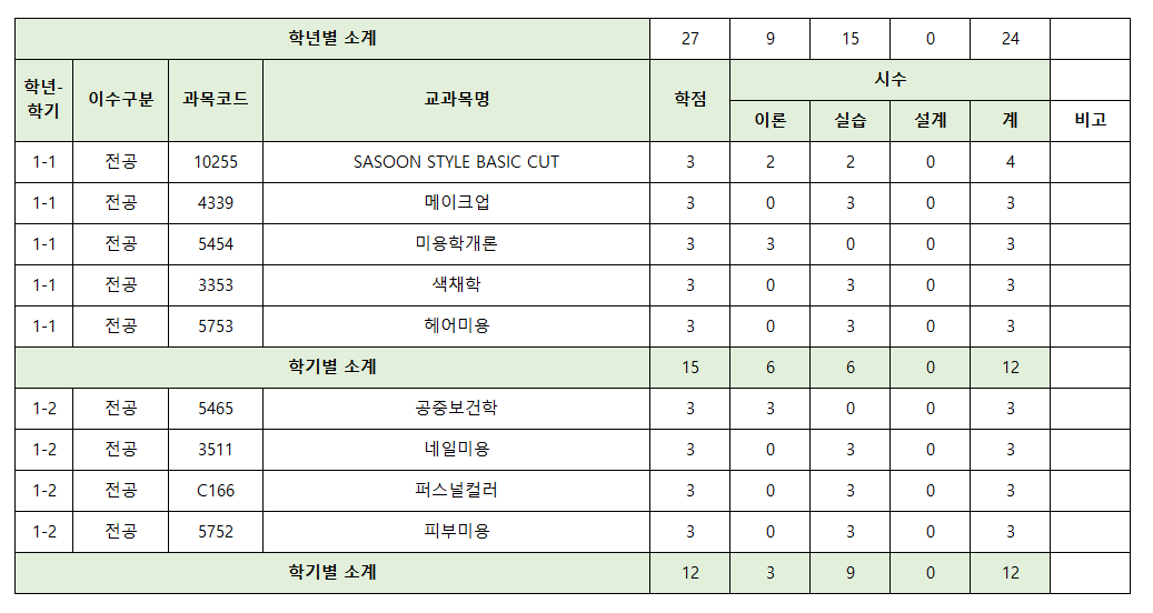 2025학년도 뷰티예술대학 헤어디자인학과 교육과정표