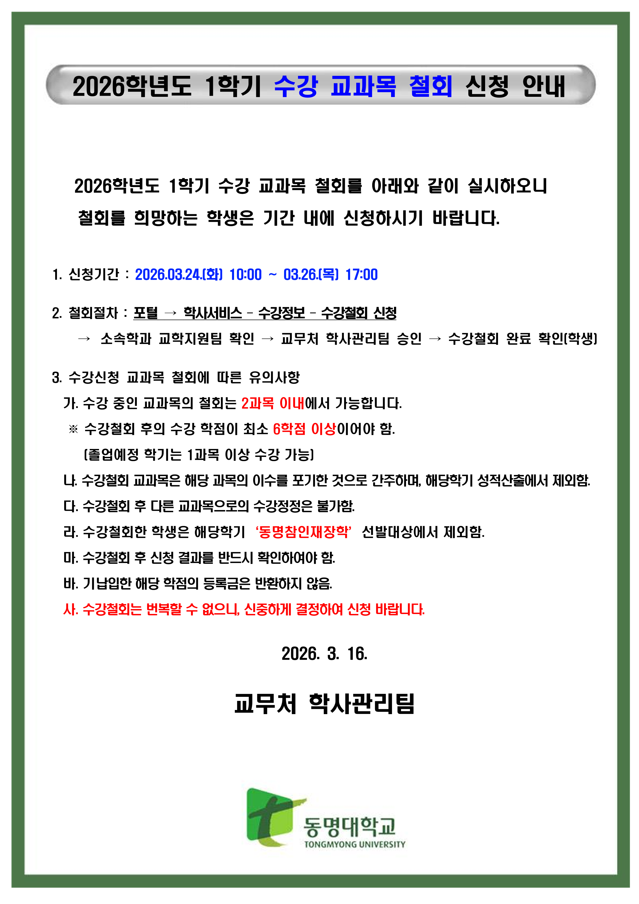 2026학년도 1학기 수강 교과목 철회 실시 안내