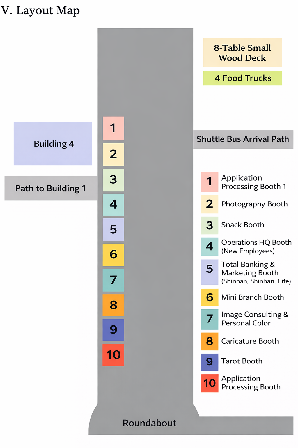 b. Booths (10 total): Operations HQ, Chalk Distribution (1 & 2), Claw Machine, Snacks, Candy Blind Date, Mini Games, Image Consulting & Personal Color, Caricature, Tarot