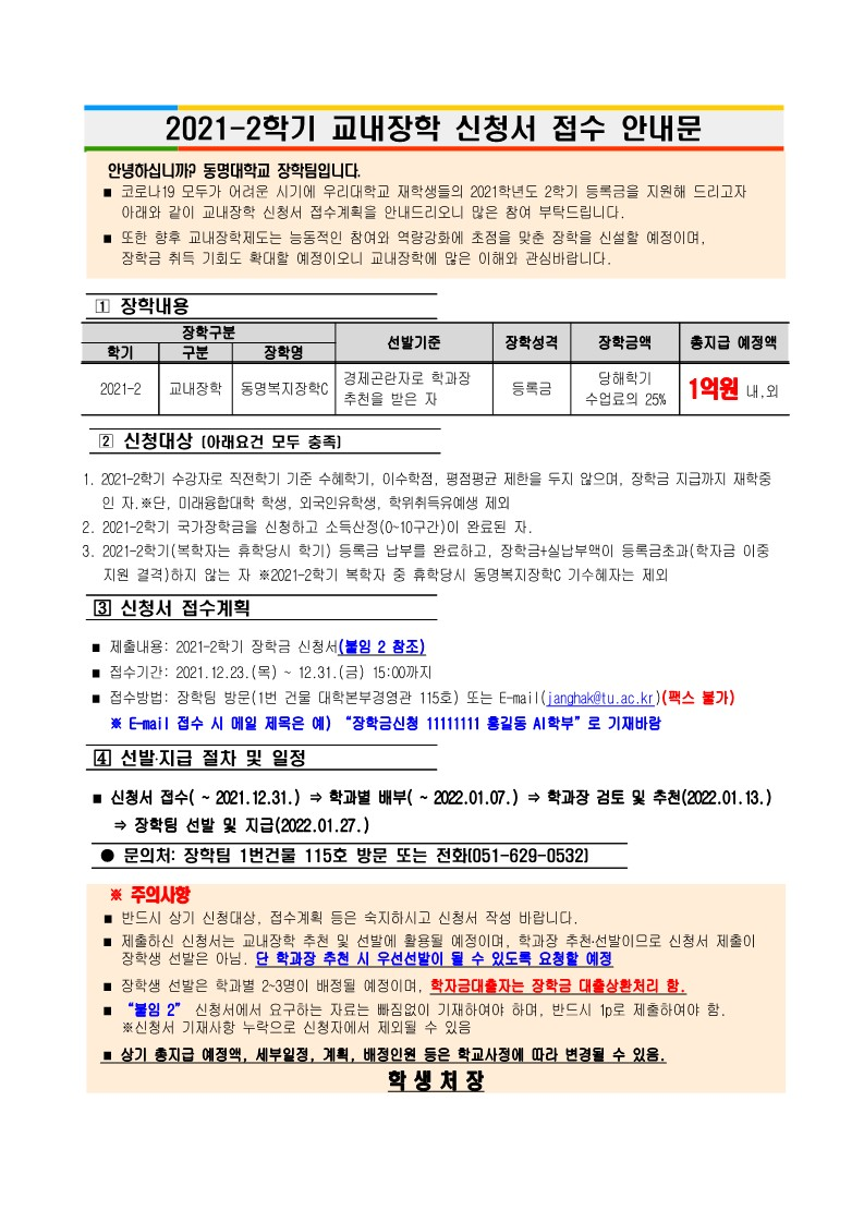 1. 공지문-교내장학(동명복지장학C) 신청접수 안내 (1).hwp