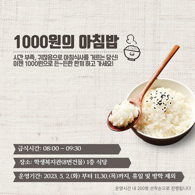 • INSTAGRAM 🍚1000원으로 해결하는 든든한 아침밥 🍚1000원으로 해결하는 든든한 아침밥 농림축산식품부와 함께하는 1000원의 아침밥❗️ 바쁘고 정신없어 거르는 아침식사 1000원으로 간편하게 챙기길 바래요👍 🔴장소 : 학생복지관(8번 건물) 1층 식당 🔵운영기간 : 2023.5.2~11.30 🟣운영시간 : 08:00 ~ 09:30 ⚠️200명 선착순으로 진행하오니 유의하시길 바랍니다.