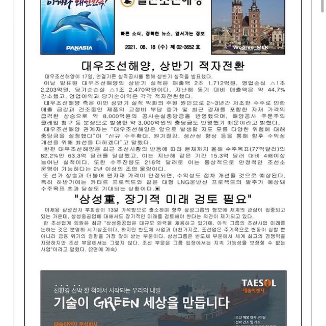 2021년 8월 23일 월요일 일간조선해양일보입니다.