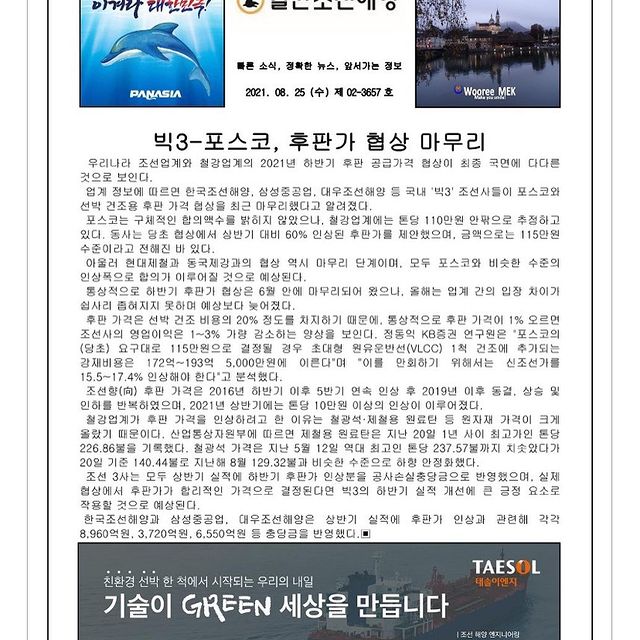 2021년 8월 25일 수요일 일간조선해양일보입니다.