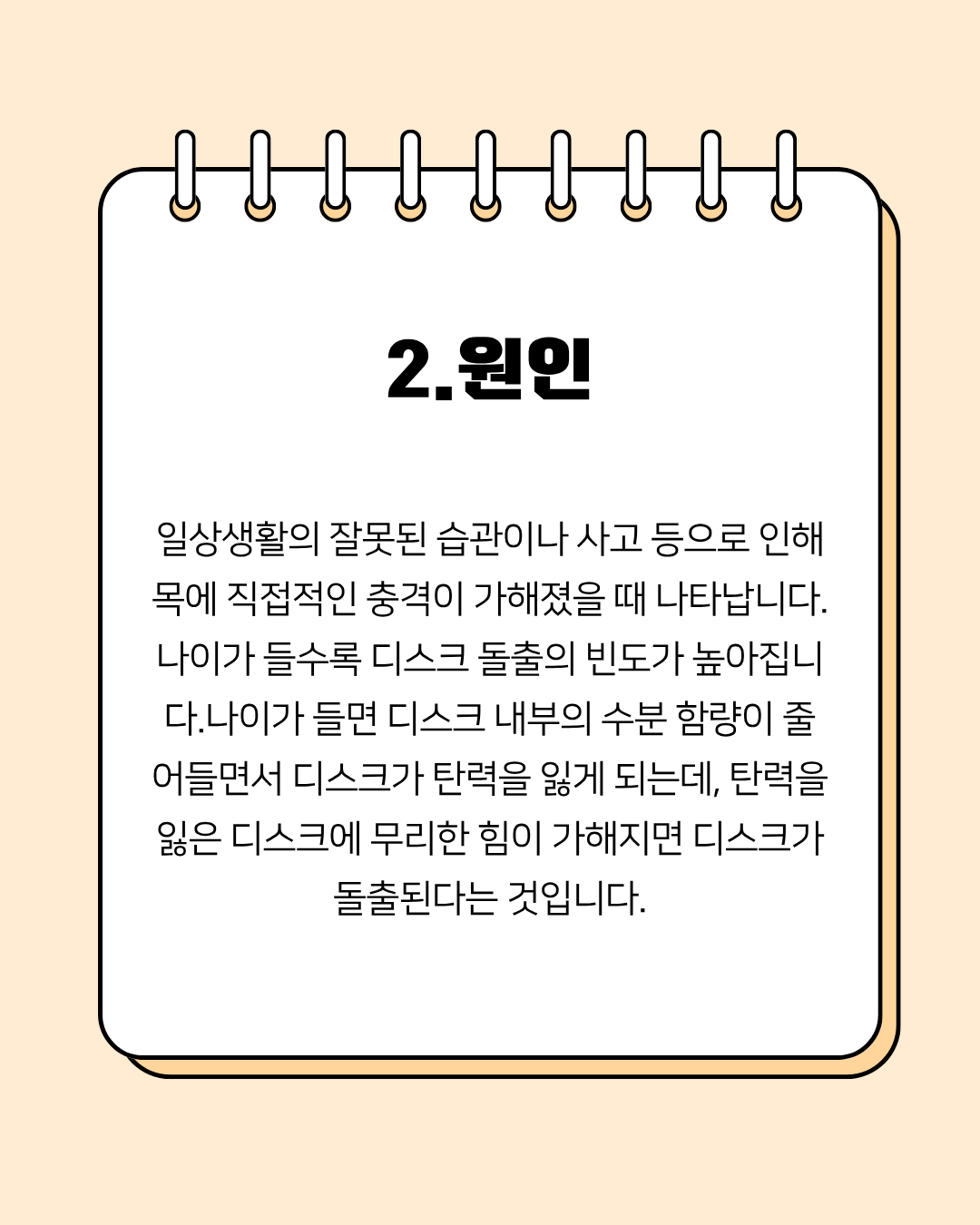 • 퇴행성 변화: 나이가 들수록 디스크 내부 수분 함량이 줄어들어 탄력이 떨어집니다. 이때 무리한 힘이 가해지면 디스크가 쉽게 돌출될 수 있습니다.