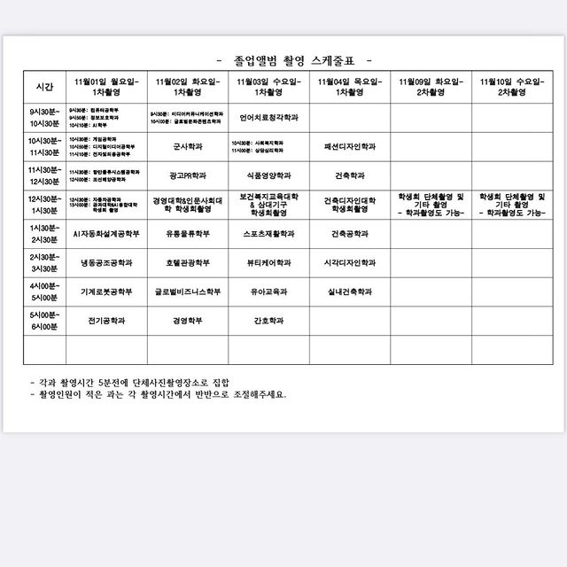 졸업 엘범 촬영 스케줄 표 입니다 :)