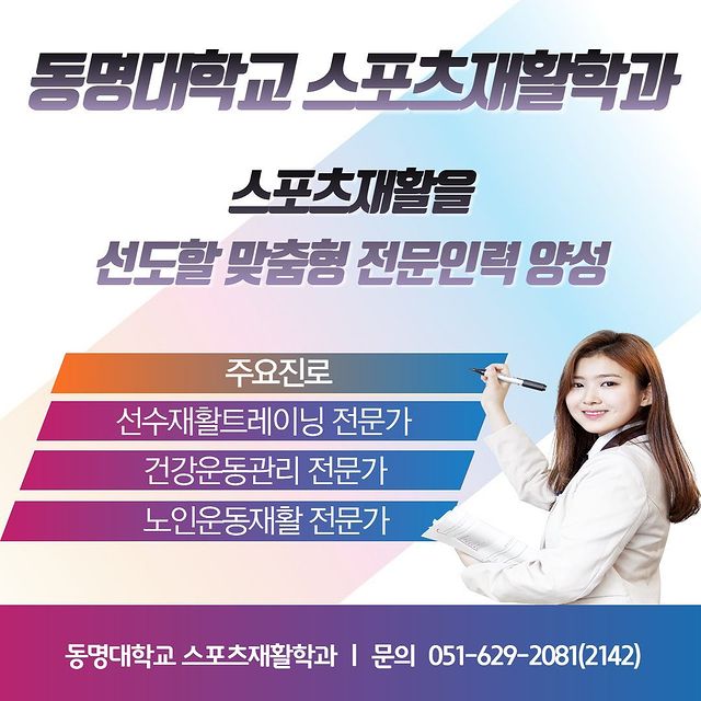 동명대학교 스포츠 재활 학과는 체계적인 시스템과 학생들의 많은 발전을 도와주는 곳입니다 :) 많은 관심 부탁드려요 ☺️
