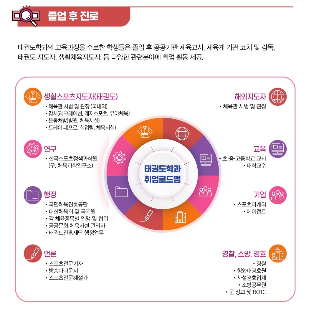 | 졸업 후 진로 | 해외지도자 체육관 사범 및 관장(국내외) 초·중·고·대학교 실업팀 코치, 강사(레크레이션, 레저스포츠, 유아체육) 심판, 운동처방사(병원,체육시설) 트레이너(프로, 실업팀, 체육시설), 초·중·고등학교 교사 대학교 교수, 태권도컨설팅 경찰 청와대경호관, 국민체육진흥공단 대한체육회, 각 체육종목별 연맹 및 협회 공공문화 체육시설 관리자, 국기원 태권도진흥재단 행정업무 |