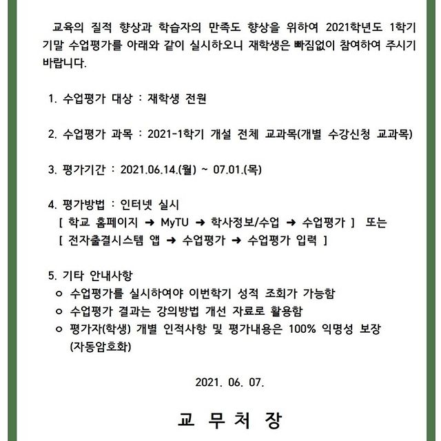 📌 2021학년도 1학기 기말고사 수업평가 실시 안내