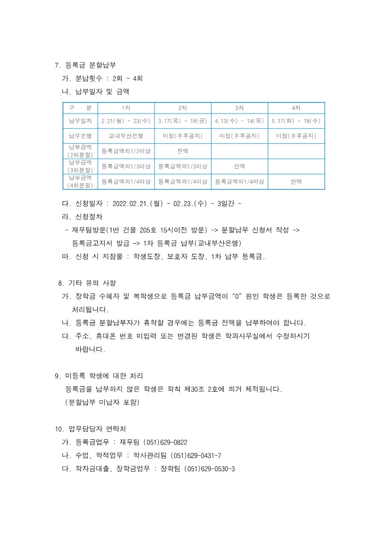 2022학년도 1학기 재학생 등록금 수납 일정 안내